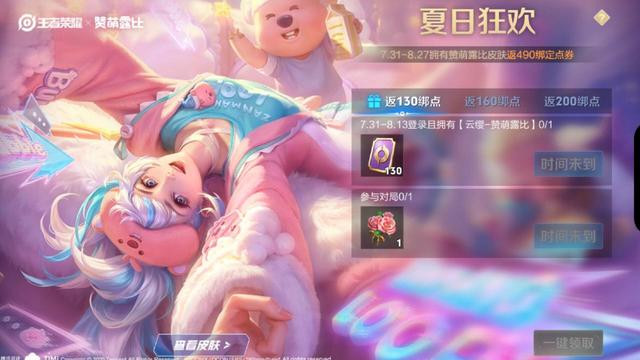 第一波返还点券的领取时间是7月31号到8月13号,只要拥有云缨的联动皮肤,就可以领取130绑定点券,参与对局还可以获得一朵亲密玫瑰。