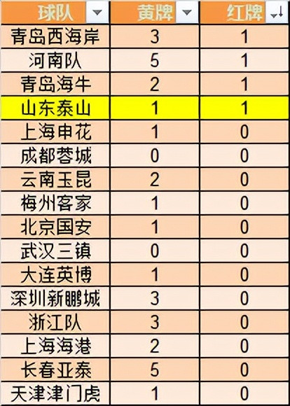 9.本轮山东泰山累计1张红牌和1张黄牌,综合排名中超第四。
