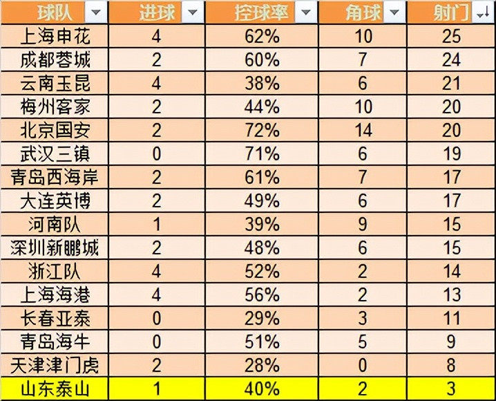 综上,山东泰山队在几项射门和传球数据中排名倒数第一,其他数据大多是中游,最让人痛心疾首的是传中成功率,居然是0,这个数据彰显了山东泰山队在进攻中的乏力和缺少接应点。