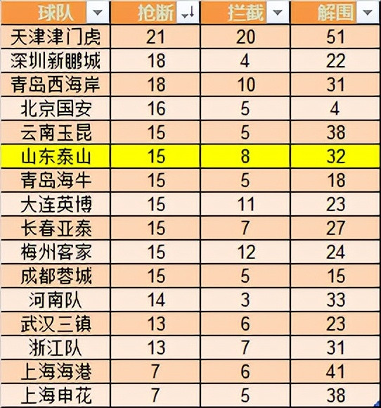 22.山东泰山本轮的抢断数是15次,并列中超第5名。