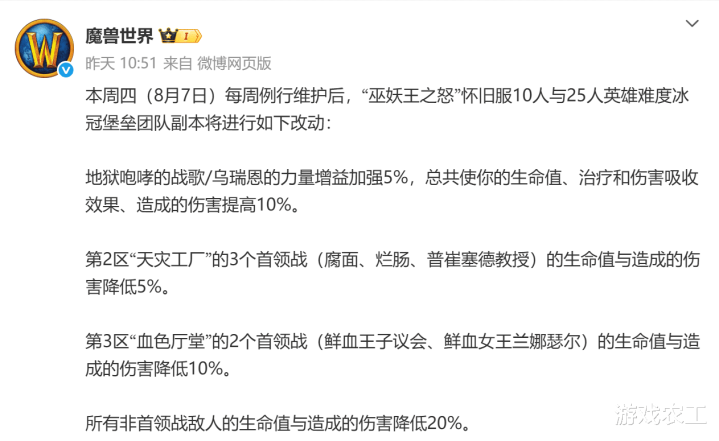 虽然魔兽世界WLK怀旧服每次削弱就会有一堆玩家们在评论区中攻击官方,但是从数据来看每次削弱确实可以带动一次新的人气回升,并且打本的活跃度也会增加,如果真的大家想AFK的话,那么即使官方削弱也不会进入游戏,所以很多时候不进游戏的话无非就是团本难度过高,因此每次削弱就会带动玩家回归,那么这次削弱了哪些东西呢?