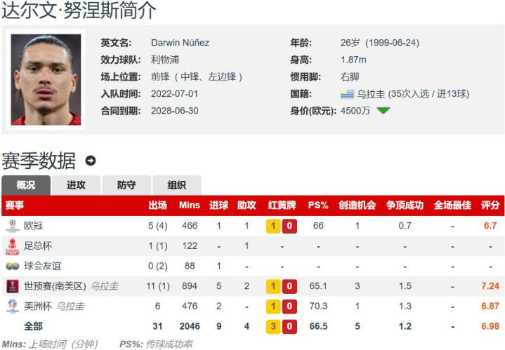 努涅斯现年26岁,当打之年,身高1.87米,右脚中锋,德转估价4500万欧元,上赛季在利物浦沦为替补,47次出场仅有17次首发,贡献7球6助。