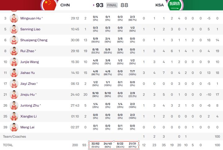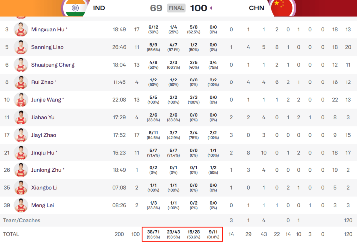 中国男篮亚洲杯小组赛各项命中率分别为51%/43.2%/75%