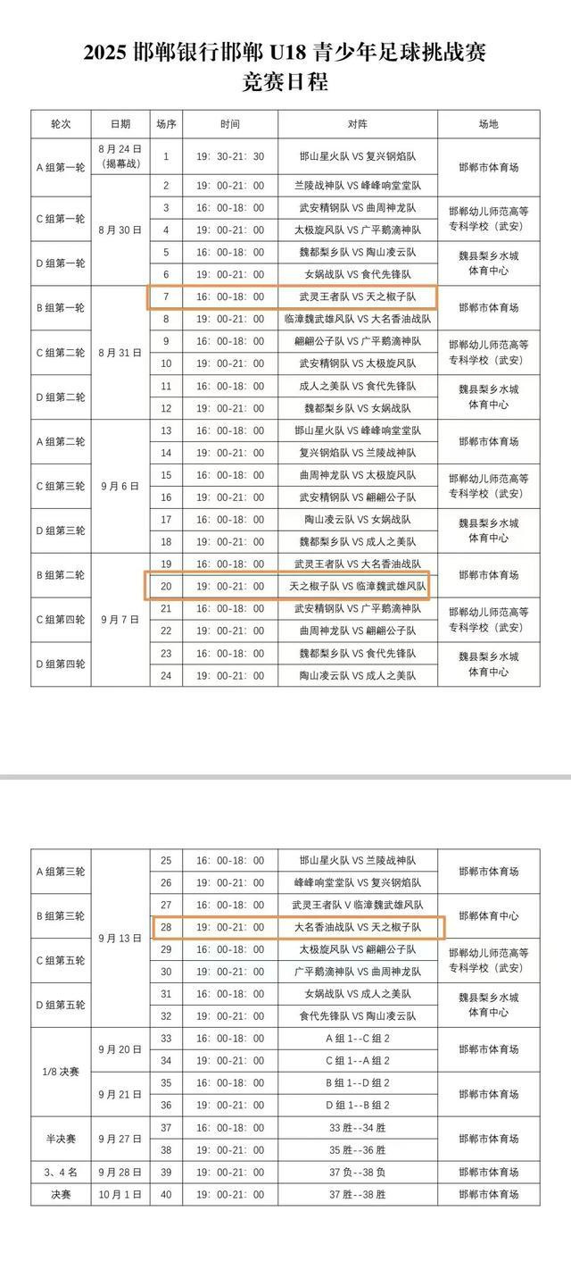 鸡泽县天之椒子队已抵达邯郸市,参加晚上举行的开幕式,并观看揭幕战。按照抽签结果和赛事安排,鸡泽县天之椒子队将于8月31日对阵丛台区武灵王者队,9月7日对阵临漳县魏武雄风队,9月13日对阵大名香油战队。