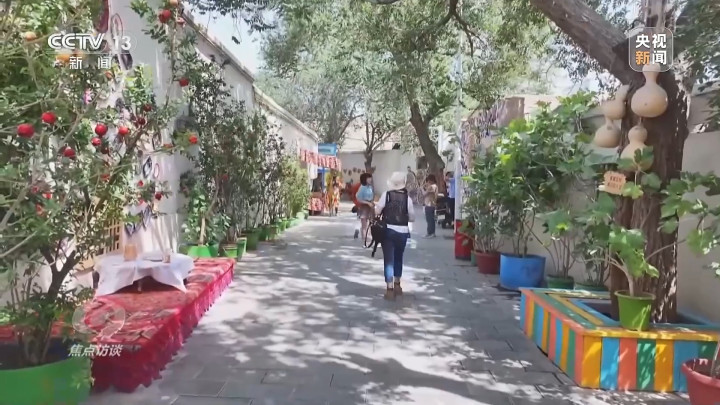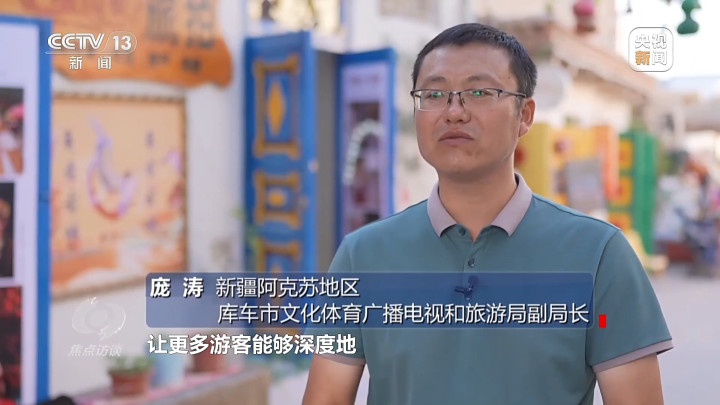 新疆维阿克苏地区库车市文化体育广播电视和旅游局副局长 庞涛:这个历史文化街区,不是一条路布到底的,而是通过星罗棋布的方式来布点,让更多游客能够深度走到老城街区巷子探索,去了解龟兹文化。今年1月到7月旅游人数已经达到700多万,相比去年同比增长一半以上。