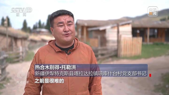 新疆伊犁特克斯县喀拉达拉镇琼库什台村党支部书记 热合木别得•托勒洪:牧民主要是以放牧为主,卖牛羊牲畜、奶制品,人均收入在6000元左右。之前是很难的,从琼库什台去县城要走一天左右,早上出发,晚上才到,去办事基本上两三天才回来。