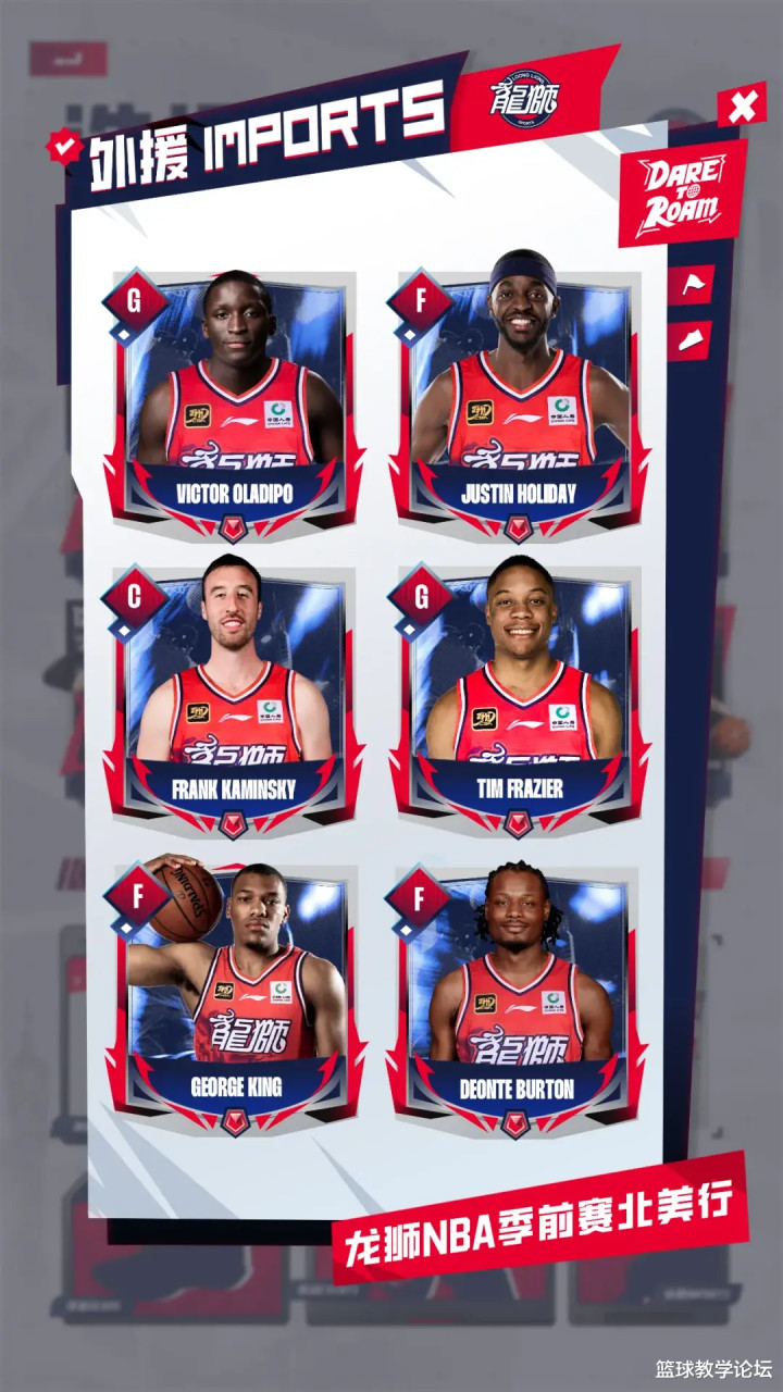 广州龙狮官宣季前赛外援阵容,其中包括多名大家熟悉的NBA旧将:奥拉迪波、贾斯汀-霍勒迪、卡明斯基、蒂姆-弗雷泽、乔治-金、德翁特-伯顿。奥拉迪波、卡明斯基等人并非要代表广州龙狮征战CBA,而是只打三场NBA季前赛。