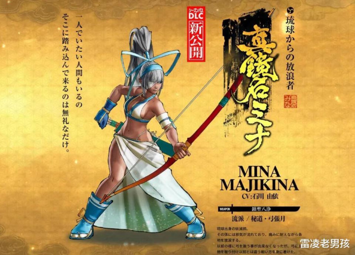 弥娜使用的武器是一张附有灵力的和弓“镇圣八净”,武艺流派是“秘道 弓张月”。在资料里所写的是远方弓道流派,从和式大弓以及射姿来看也就是前往本州学习正儿八经的和弓道。在《侍魂》里一众短中距离的武器中,使用弓道的弥娜算是一个异类角色。