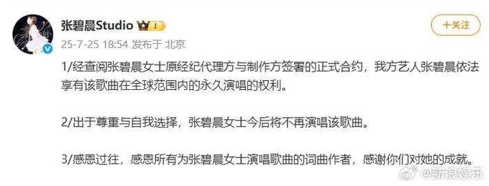 然而,张碧晨方面同时宣布,出于尊重与自我选择,今后将不再演唱该歌曲。工作室也对歌曲创作者表达了感谢。