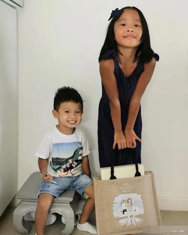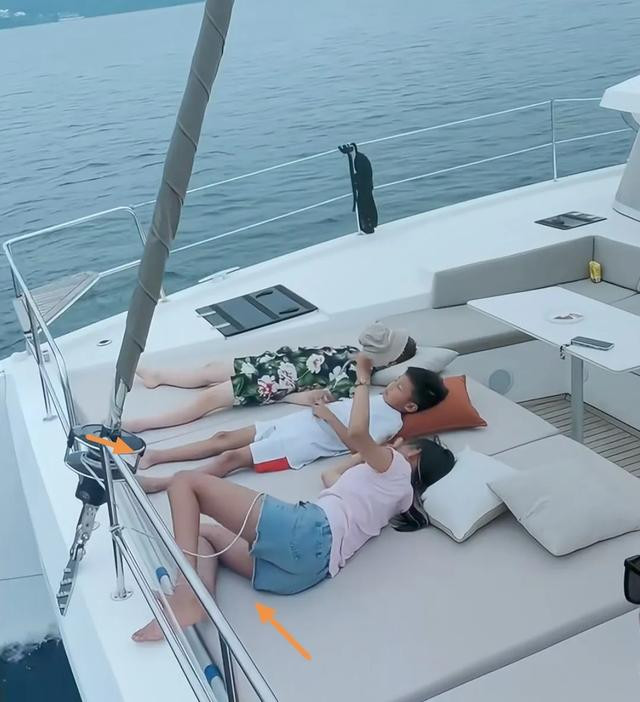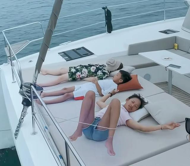 他们的黑皮肤跟大长腿都遗传了名模妈妈,他们跟外国小朋友一起躺在游艇上,弟弟的腿又直又细,12岁姐姐的腿则弯曲着,仔细看这宽长的沙发床已经快装不下她的大长腿了。