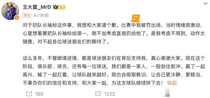 在部分山东球迷在社媒上表达了对王大雷这一行为的不满之后,其也是强硬的表示爱谁谁!并写了一段关于队长袖标的不知其所以然的话,这更是引起了双方的对立,球迷纷纷表示王大雷不配呆在泰山队。