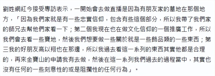 网红还澄清,当天不是专程去大S墓地直播,而是有朋友家的墓地在金宝山,带家里的师兄去看看,自己从事文化相关的推广工作,然后好朋友高以翔的墓地也在,最后是金宝山方面也申请让他去做,所以才会开直播。