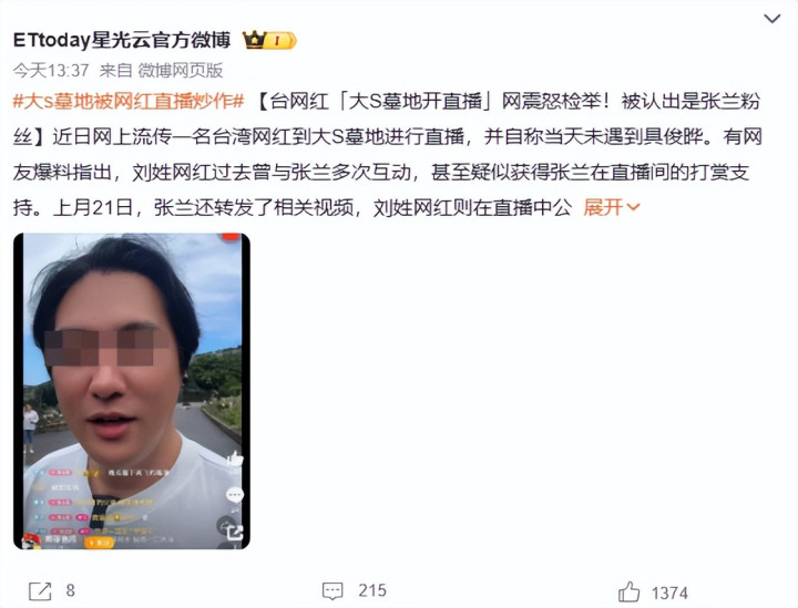 8月5日,这位刘姓网红接受台媒采访,承认与张兰认识,但否认在大S墓地直播蹭热度。