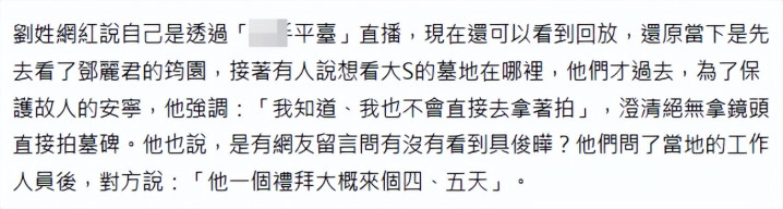 强调直播过程没人阻拦,因为金宝山是开放的,就是供人参观,期间有网友询问大S的墓地,才顺便看看,绝对没有直接拍墓碑,询问了工作人员,对方表示具俊晔每个星期来四五天,也质疑大S的墓碑为什么不写中文。