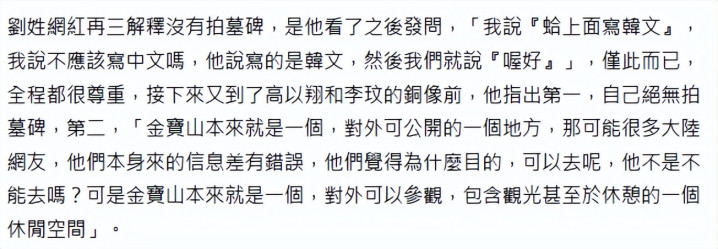 网红最后解释大陆网友可能会有信息差,以为自己是有目的,其实不是,因为金宝山就是一个休闲空间,他当天计划去看邓丽君、然后是高以翔和李玟,并非专程去拍大S墓地。