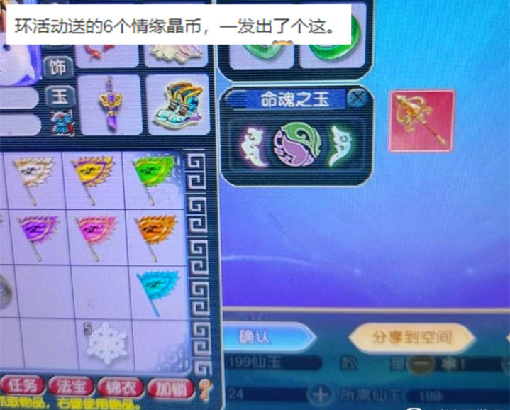 大家如果刷了今年的暑假活动玩法,那么在暑假活动玩法中可以获得神秘晶石,神秘晶石就可以兑换为情缘晶币,上面这位玩家现在领取的就是在暑假活动玩法中获得的6个情缘晶币,而且上面这位玩家还一发入魂了,不过不是一发入魂抽出奇袭祥瑞鲲,而是一发入魂开出来了一个九环锡杖,这是一个需要使用大量仙玉积分才能够兑换的稀有武器装饰。结果现在却被上面这位玩家给白嫖了,所以想要低成本获得这些稀有道具的玩家,可以在暑假活动还没有结束之前尽可能的去提升灵韵等级。