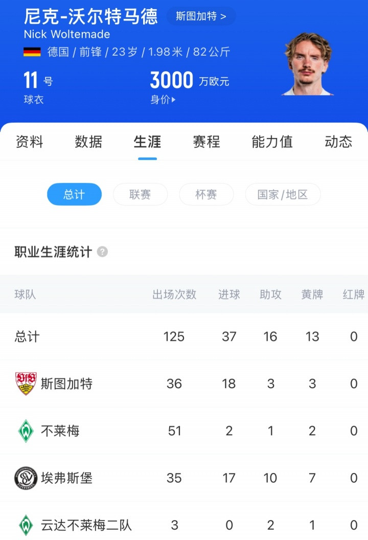 沃尔特马德现年23岁,德国前锋,与斯图加特现有合同在2028年到期,现德转估值为3000万欧。上赛季,沃尔特马德为斯图加特出战33场,打进17球并取得3次助攻。