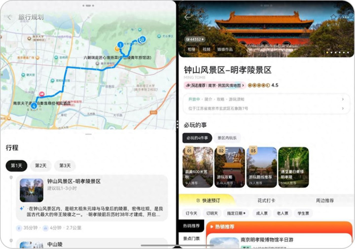 小艺旅行规划功能与华为Mate XTs非凡大师的大屏结合,体验感更胜一筹。当用户点击小艺攻略中的蓝色文字链接时,系统自动进入分屏显示——左侧展示全程旅行攻略,右侧呈现景点、酒店或美食详情,这种“一屏多用”的交互方式,极大发挥了Mate XTs的大屏优势,“左右开弓”,重点信息一屏尽览,让旅行规划更加轻松直观。