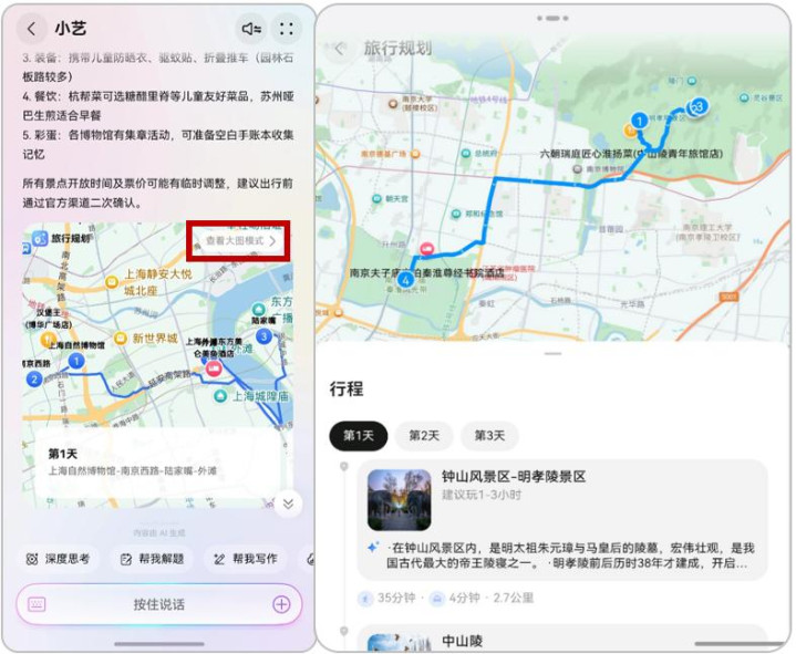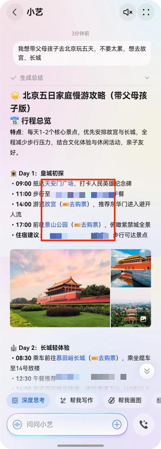 一键调用,无缝跳转服务:定路线、找住宿、寻美食……规划途中各类刚需服务,小艺统统为你聚合到位!点击攻略中蓝色关键词即可一键跳转相应平台购票、导航、预订,操作无缝衔接,彻底告别反复切换APP、信息割裂的传统模式。