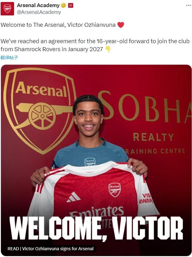官方:阿森纳宣布和沙姆洛克流浪者就维克托-奥日安武纳的转会达成了协议,这名16岁的新星将在2027年1月份年满18周岁后正式登陆北伦敦。