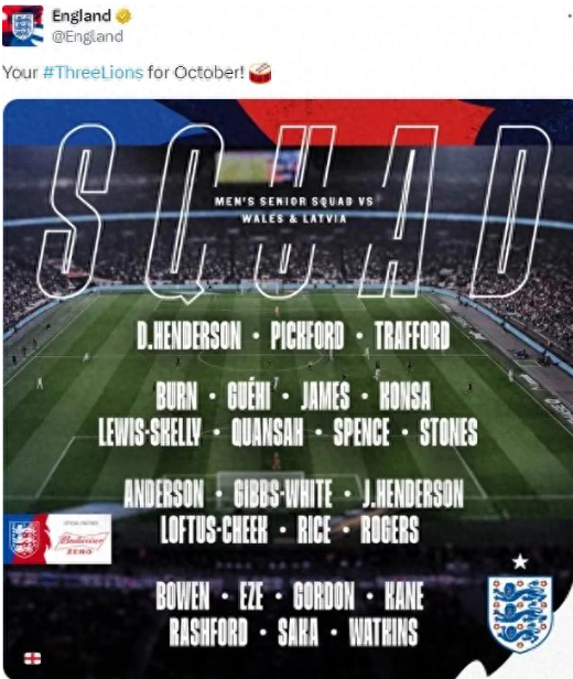 官方:斯凯利、赖斯、埃泽和萨卡入选了最新一期的英格兰大名单。