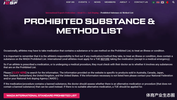 在IESF官方网站可以极其轻易地找到反兴奋剂条例入口,其规则完全遵从国际反兴奋剂联盟WADA的条例——在2013年与WADA建立合作关系以来,IESF就一直在使用WADA提供的禁药列表。