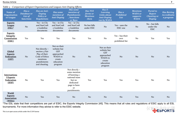 从上图(来源:Entering Cheat Codes or to Play True: Where is Anti-Doping going within Esports? International Journal of Esports, 1)可以看出,电子竞技诚信委员会ESIC是在这方面做得最全面的一个组织,也是唯一一个拥有电竞选手违禁药物使用记录(以及假赛赌赛)数据库的组织。