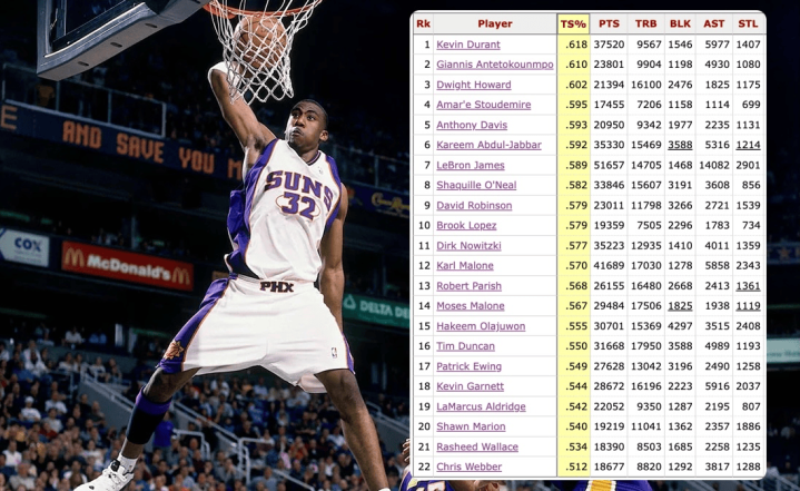 美记AndyBailey分享数据:NBA历史上在得分、篮板、盖帽、助攻、抢断和真实命中率(包括季后赛)总数据上匹配或超过阿马雷-斯塔德迈尔的球员仅三人:凯文-杜兰特、扬尼斯-阿德托昆博和德怀特-霍华德。