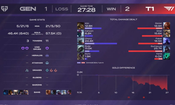 第二局,GEN利用崔斯特的全球流大招针对T1的核心英雄杰斯,拿下2个击杀。GEN持续压制上路,但T1在GEN尝试越塔时反击得手,拿到3个击杀。T1随后在峡谷先锋团战中率先击杀GEN的斯卡纳,赢得战斗并拿下资源团战,Gumayusi的霞超前发育,队伍进一步拉开差距。就在GEN试图反击时,Chovy开启大招传送后过于深入,T1抓住机会将其击杀,形成4对5的局面,霞击杀四人后掌握胜势。T1顶住GEN的攻势,摧毁了对方水晶枢纽,将比赛拖到决胜局。