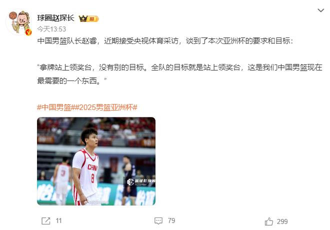 赵睿在接受央视采访时透露:本次亚洲杯的目标是全队站上领奖台,这对于中国男篮来说很重要。(换言之不是夺冠,而是进入前三名)