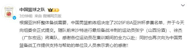 中国篮球之队官方写道:根据亚洲杯整体备战需要,中国男篮教练组决定了2025FIBA亚洲杯参赛名单,并于今天向组委会正式提交。随队前来沙特进行最后备战冲刺的运动员张宁(山西汾酒)、徐杰(广东宏远)将离队,感谢各位运动员在集训期间的全力以赴;同时也再次向为中国男篮备战工作提供支持与帮助的单位及人员表示衷心的感谢!