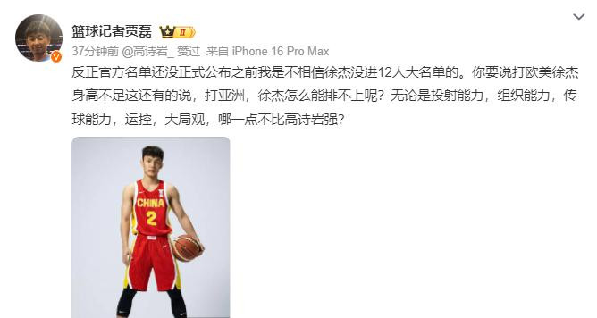 贾磊公开质疑这份大名单,他写道:在官方公布大名单之前我是不相信徐杰落选的。你要说打欧美徐杰身高不足这还有的说,打亚洲,徐杰怎么能排不上呢?无论是投射能力,组织能力,传球能力,运控,大局观,哪一点不比高诗岩强?
