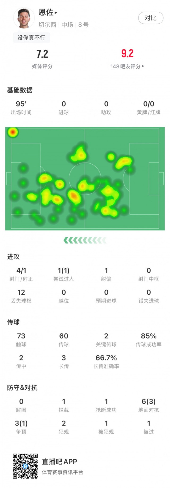 恩佐全场数据: 1射正2关键传球85%传球成功率, 获评7.2分
