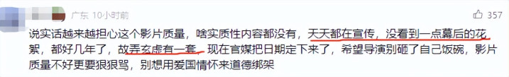 也有人说,越来越担心这个影片质量,天天都在宣传,没看到一点幕后的花絮,都好几年了,故弄玄虚有一套,希望导演别砸了自己饭碗,影片质量不好更要狠狠骂,别想用爱国情怀来道德绑架!