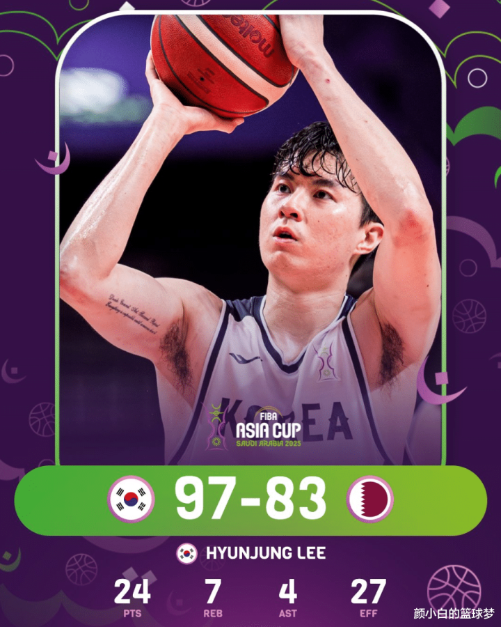 北京时间8月8日,男篮亚洲杯A组小组赛,韩国男篮97-83大胜卡塔尔男篮拿到本届亚洲杯上的首胜。这场胜利对于韩国男篮来说非常重要,他们拿下这场胜利后升至A组第一(因为澳大利亚第二场还没打),第二节单节28-16最为关键,末节卡塔尔疯狂追分但李贤重一人11分+6罚连中浇灭了卡塔尔的反扑气焰。