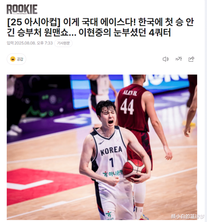 韩国媒体Roolie赛后立马发文:韩国队的超级王牌完成独角戏,他帮助韩国队拿到亚洲杯上的首胜。文中提到李贤重在末节连拿11分十分出彩,最后的6个罚球也非常稳健,希望他将这种竞技状态带到最后一场打黎巴嫩的比赛中,力争以A组第二的身份进入八强附加赛。