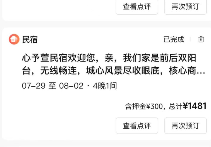 吕女士介绍,暑假期间自己和家人带孩子到贵州旅游,通过携程平台订下兴义市两套民宿,其中一处位于义城·银座1605号心予萱民宿,时间为7月29日至8月2日,共计1481元(含押金300元)。
