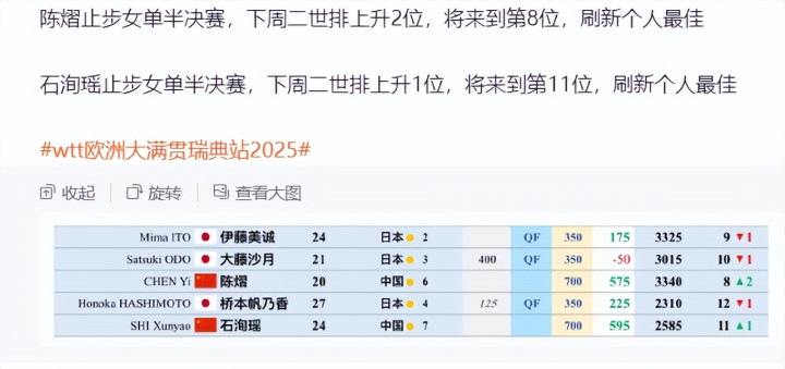陈熠获得700积分后,下周她的世界排名会升至第八刷新个人生涯最佳,石洵瑶也获得700积分,下周世排升至第11也刷新个人生涯最佳。