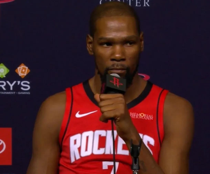 杜兰特今天第一次穿火箭球衣,走进火箭的训练馆,他也表示,对此非常的兴奋,能成为一名新的火箭人,太棒了!他已经迫不及待了,想要开启新赛季,至于夺冠,他认为只需放平心态,注重细节,保持书呆子气,准确的来讲应该是键盘侠气。