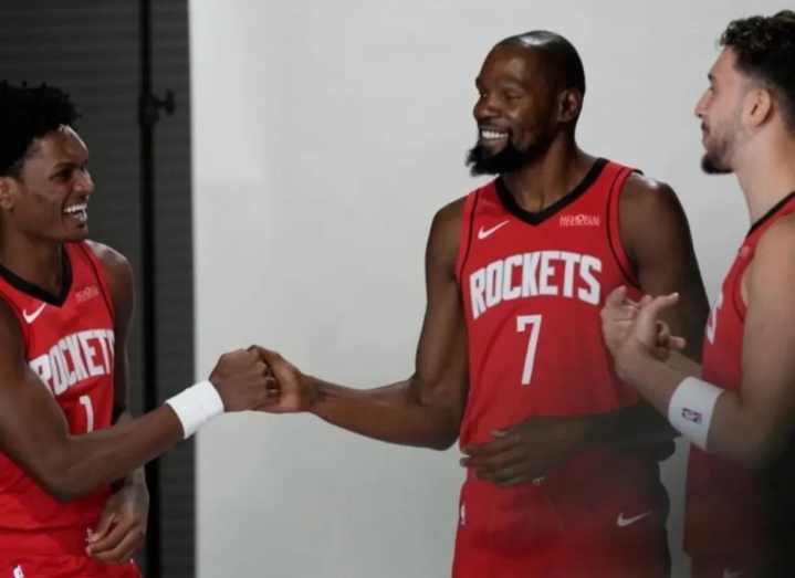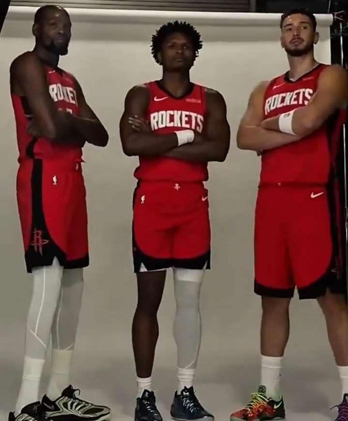 首先来看一下,下面这幅图片,有可能在未来成为经典,第一次穿上火箭球衣的杜兰特,于今年在欧锦赛大放异彩的申京,再加上火箭的未来门面,阿门,三人相遇,这也意味着火箭新版的3巨头正式成立了,这张照片,相信在不久的将来,会成为NBA的一幅名画面。