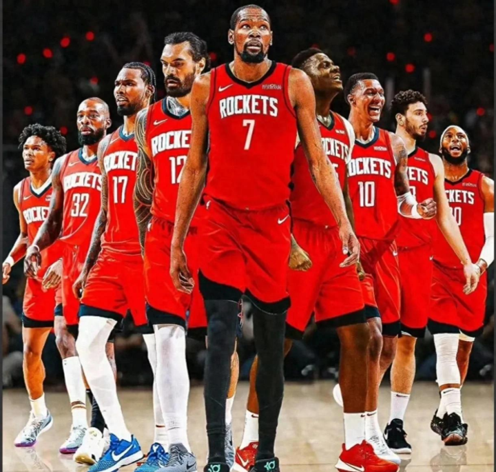 从火箭今天拍摄定妆照的情形来看,杜兰特、阿门、神经、申京,毫无疑问是这支球队的前3号人物,原本杜兰特是站在最中间的,但随后杜兰特将阿门,拉到了中间,从而形成下面这个画面,这也说明了,杜兰特甘当绿叶,愿意辅佐阿门成长。